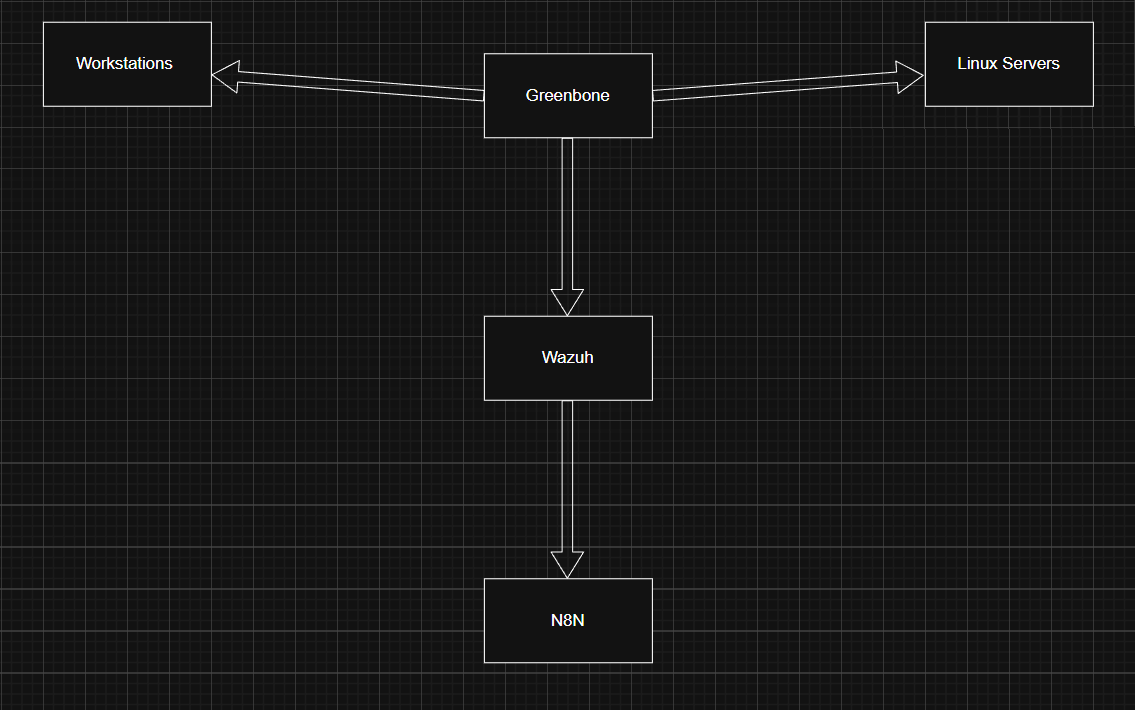 This diagram outlines how vulnerability scan results are correlated with system telemetry to identify exposed services, prioritize risk, and generate actionable security events.